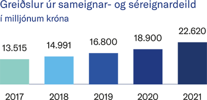 Sjóðfélögum á lífeyri fjölgaði áfram á árinu og voru um 22 þúsund í lok árs samanborið við 20 þúsund árið áður. Lífeyrisgreiðslur sameignardeildar hækkuðu einnig og námu 22 milljörðum á árinu samanborið við 18 milljarða árið 2020.
