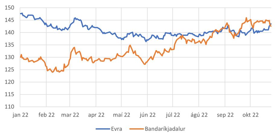 Mynd: Gengi íslensku krónunnar gagnvart USD og EUR frá 31.12.2021 til 28.10.2022