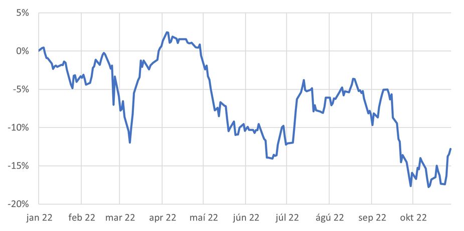 Lakari alþjóðlegar hagvaxtarhorfur, aukin verðbólga og hærra vaxtastig hafa litað alþjóðlega hlutabréfamarkaði. Frá áramótum hefur heimsvísitala hlutabréfa (MSCI World) lækkað um 25,4% mælt í Bandaríkjadal. Segja má að tveggja ára ávöxtun hafi verið þurrkuð út. Flestar vísitölur hlutabréfa, hvort sem það er í Bandaríkjunum, Evrópu eða Asíu hafa lækkað í verði.