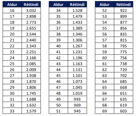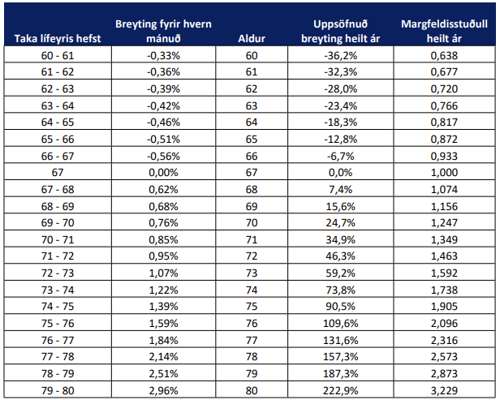 Margfalda skal réttindi skv. töflu I með viðeigandi margfeldisstuðli miðað við lífeyristökualdur.