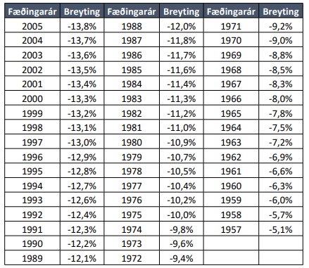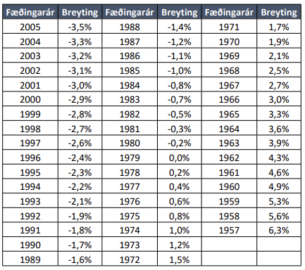 Þannig eru áunnin réttindi hvers fæðingarárgangs umreiknuð þannig að áfallnar skuldbindingar A- deildar vegna hvers fæðingarárgangs halda sér óbreyttar samkvæmt nýjum dánar- og eftirlifendatöflum. Af þessu leiðir að áunnin réttindi lækka í samræmi við eftirfarandi töflu: